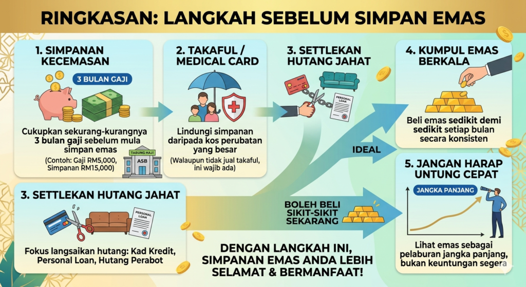 Tak kn nk tunggu Duit kecemasan cukup dulu, hutang selesai dulu baru boleh simpan emas, kalau pendapat saya dan dari buku buku yg sy duk baca sepatutnya macam tu. Tapi harga emas sekarang cepat sangat naik dan turun.